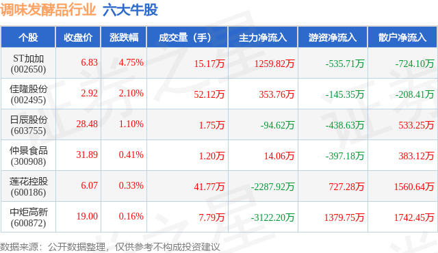 个股表现方面,调味发酵品行业当日领涨股为ST加加(002650),该股当日报收6.83,上涨4.75%,成交量15.17万,主力资金净流入1259.82万元。佳隆股份(002495)以上涨2.1%紧随其后,该股当日成交量52.12万,主力资金净流入353.76万元。除此之外,日辰股份(603755)、仲景食品(300908)、莲花控股(600186)均进入当日牛股之列。具体个股列表见下表: