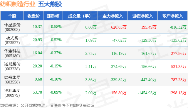 个股表现方面,纺织制造行业当日领跌股为伟星股份(002003),该股当日报收10.37,下跌0.58%,成交量8.6万,主力资金净流入620.83万元。夜光明(873527)以下跌0.52%紧随其后,该股当日成交量1.09万,主力资金净流出47.02万元。除此之外,华生科技(605180)、诺邦股份(603238)、健盛集团(603558)均进入当日熊股之列。具体个股列表见下表: