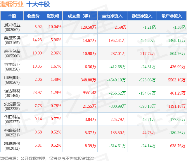 个股表现方面,造纸行业当日领涨股为景兴纸业(002067),该股当日报收5.92,上涨10.04%,成交量129.5万,主力资金净流入2.59亿元。荣晟环保(603165)以上涨5.96%紧随其后,该股当日成交量14.67万,主力资金净流入1952.41万元。除此之外,森林包装(605500)、恒丰纸业(600356)、山鹰国际(600567)均进入当日牛股之列。具体个股列表见下表: