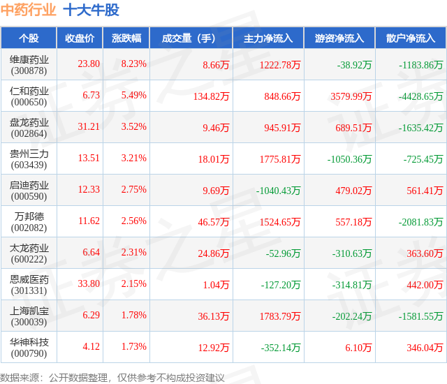 个股表现方面,中药行业当日领涨股为维康药业(300878),该股当日报收23.8,上涨8.23%,成交量8.66万,主力资金净流入1222.78万元。仁和药业(000650)以上涨5.49%紧随其后,该股当日成交量134.82万,主力资金净流入848.66万元。除此之外,盘龙药业(002864)、贵州三力(603439)、启迪药业(000590)均进入当日牛股之列。具体个股列表见下表: