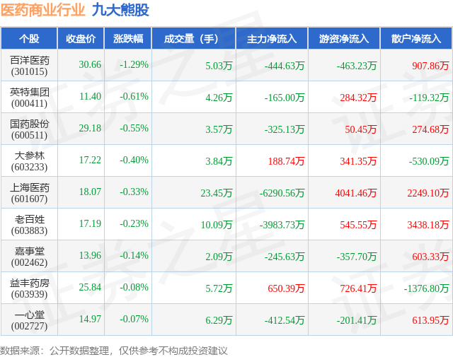 个股表现方面,医药商业行业当日领跌股为百洋医药(301015),该股当日报收30.66,下跌1.29%,成交量5.03万,主力资金净流出444.63万元。英特集团(000411)以下跌0.61%紧随其后,该股当日成交量4.26万,主力资金净流出165.0万元。除此之外,国药股份(600511)、大参林(603233)、上海医药(601607)均进入当日熊股之列。具体个股列表见下表: