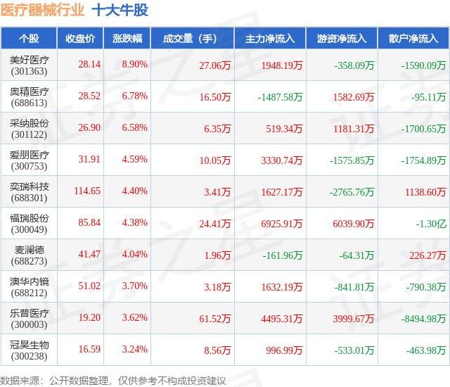个股表现方面,医疗器械行业当日领涨股为美好医疗(301363),该股当日报收28.14,上涨8.9%,成交量27.06万,主力资金净流入1948.19万元。奥精医疗(688613)以上涨6.78%紧随其后,该股当日成交量16.5万,主力资金净流出1487.58万元。除此之外,采纳股份(301122)、爱朋医疗(300753)、奕瑞科技(688301)均进入当日牛股之列。具体个股列表见下表: