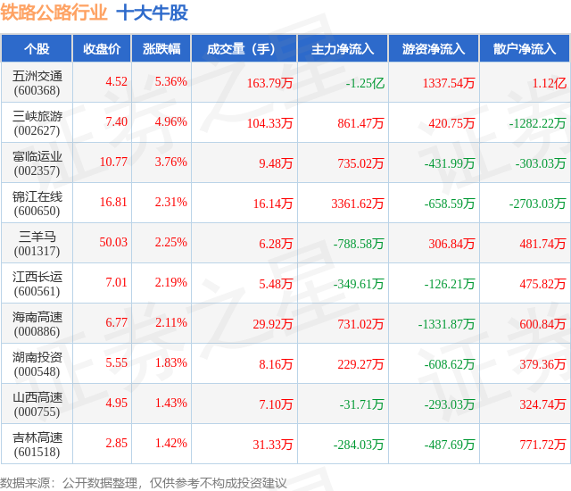 个股表现方面,铁路公路行业当日领涨股为五洲交通(600368),该股当日报收4.52,上涨5.36%,成交量163.79万,主力资金净流出1.25亿元。三峡旅游(002627)以上涨4.96%紧随其后,该股当日成交量104.33万,主力资金净流入861.47万元。除此之外,富临运业(002357)、锦江在线(600650)、三羊马(001317)均进入当日牛股之列。具体个股列表见下表: