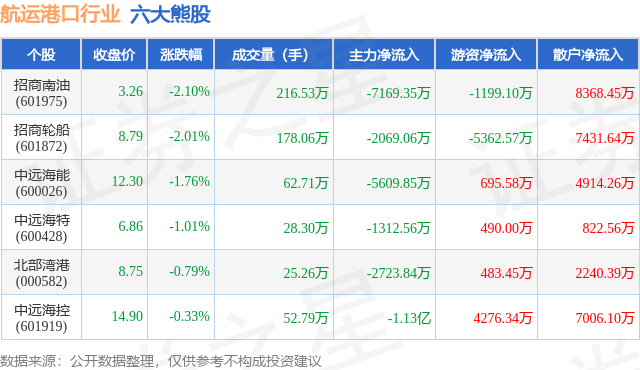 个股表现方面,航运港口行业当日领跌股为招商南油(601975),该股当日报收3.26,下跌2.1%,成交量216.53万,主力资金净流出7169.35万元。招商轮船(601872)以下跌2.01%紧随其后,该股当日成交量178.06万,主力资金净流出2069.06万元。除此之外,中远海能(600026)、中远海特(600428)、北部湾港(000582)均进入当日熊股之列。具体个股列表见下表: