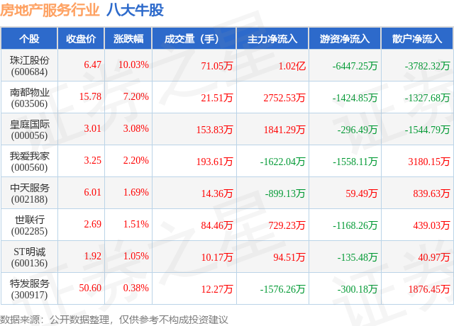 个股表现方面,房地产服务行业当日领涨股为珠江股份(600684),该股当日报收6.47,上涨10.03%,成交量71.05万,主力资金净流入1.02亿元。南都物业(603506)以上涨7.2%紧随其后,该股当日成交量21.51万,主力资金净流入2752.53万元。除此之外,皇庭国际(000056)、我爱我家(000560)、中天服务(002188)均进入当日牛股之列。具体个股列表见下表: