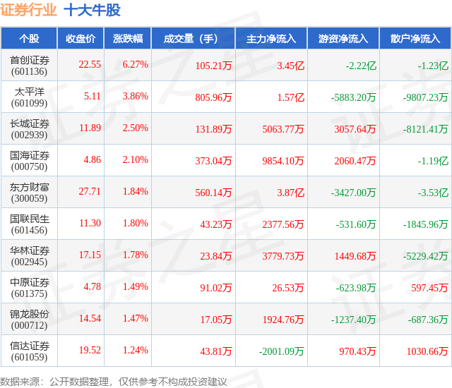 个股表现方面,证券行业当日领涨股为首创证券(601136),该股当日报收22.55,上涨6.27%,成交量105.21万,主力资金净流入3.45亿元。太平洋(601099)以上涨3.86%紧随其后,该股当日成交量805.96万,主力资金净流入1.57亿元。除此之外,长城证券(002939)、国海证券(000750)、东方财富(300059)均进入当日牛股之列。具体个股列表见下表:
