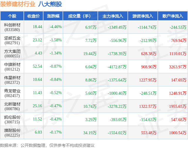 个股表现方面,装修建材行业当日领跌股为科创新材(833580),该股当日报收18.44,下跌4.46%,成交量6.97万,主力资金净流出1349.49万元。坚朗五金(002791)以下跌1.58%紧随其后,该股当日成交量7.72万,主力资金净流出556.96万元。除此之外,方大集团(000055)、中旗新材(001212)、伟星新材(002372)均进入当日熊股之列。具体个股列表见下表: