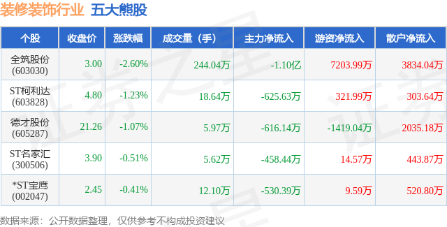 个股表现方面,装修装饰行业当日领跌股为全筑股份(603030),该股当日报收3.0,下跌2.6%,成交量244.04万,主力资金净流出1.1亿元。ST柯利达(603828)以下跌1.23%紧随其后,该股当日成交量18.64万,主力资金净流出625.63万元。除此之外,德才股份(605287)、ST名家汇(300506)、*ST宝鹰(002047)均进入当日熊股之列。具体个股列表见下表: