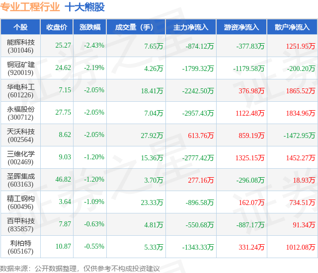 个股表现方面,专业工程行业当日领跌股为能辉科技(301046),该股当日报收25.27,下跌2.43%,成交量7.65万,主力资金净流出874.12万元。铜冠矿建(920019)以下跌2.19%紧随其后,该股当日成交量4.26万,主力资金净流出1799.32万元。除此之外,华电科工(601226)、永福股份(300712)、天沃科技(002564)均进入当日熊股之列。具体个股列表见下表: