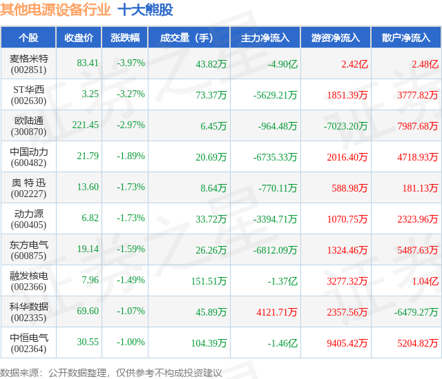 个股表现方面,其他电源设备行业当日领跌股为麦格米特(002851),该股当日报收83.41,下跌3.97%,成交量43.82万,主力资金净流出4.9亿元。ST华西(002630)以下跌3.27%紧随其后,该股当日成交量73.37万,主力资金净流出5629.21万元。除此之外,欧陆通(300870)、中国动力(600482)、奥 特 迅(002227)均进入当日熊股之列。具体个股列表见下表: