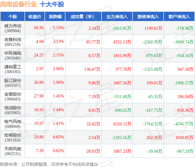 个股表现方面,风电设备行业当日领涨股为威力传动(300904),该股当日报收69.36,上涨5.33%,成交量2.34万,主力资金净流出1011.85万元。吉鑫科技(601218)以上涨3.13%紧随其后,该股当日成交量85.77万,主力资金净流入4352.13万元。除此之外,中环海陆(301040)、通裕重工(300185)、振江股份(603507)均进入当日牛股之列。具体个股列表见下表: