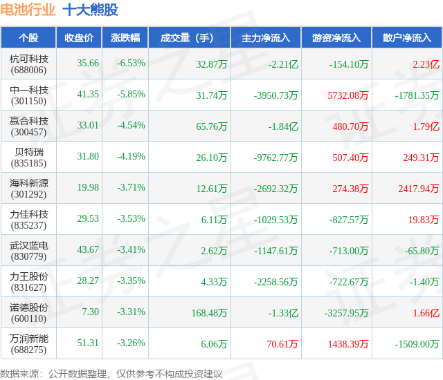 个股表现方面,电池行业当日领跌股为杭可科技(688006),该股当日报收35.66,下跌6.53%,成交量32.87万,主力资金净流出2.21亿元。中一科技(301150)以下跌5.85%紧随其后,该股当日成交量31.74万,主力资金净流出3950.73万元。除此之外,赢合科技(300457)、贝特瑞(835185)、海科新源(301292)均进入当日熊股之列。具体个股列表见下表: