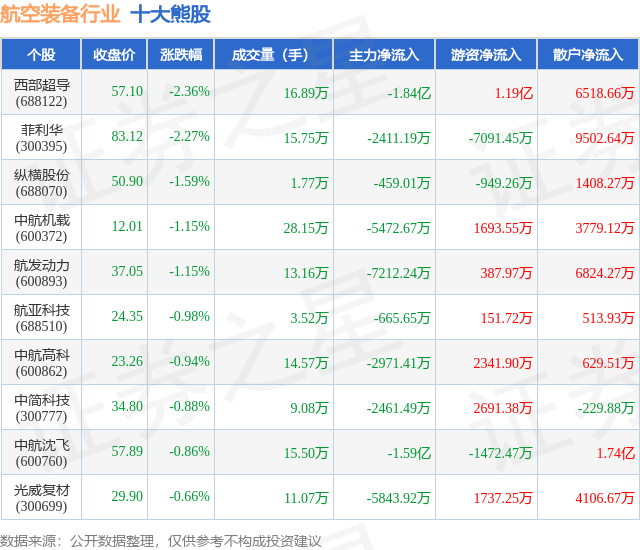 个股表现方面,航空装备行业当日领跌股为西部超导(688122),该股当日报收57.1,下跌2.36%,成交量16.89万,主力资金净流出1.84亿元。菲利华(300395)以下跌2.27%紧随其后,该股当日成交量15.75万,主力资金净流出2411.19万元。除此之外,纵横股份(688070)、中航机载(600372)、航发动力(600893)均进入当日熊股之列。具体个股列表见下表: