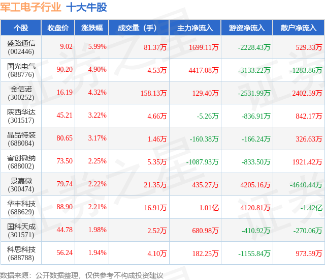 个股表现方面,军工电子行业当日领涨股为盛路通信(002446),该股当日报收9.02,上涨5.99%,成交量81.37万,主力资金净流入1699.11万元。国光电气(688776)以上涨4.9%紧随其后,该股当日成交量4.53万,主力资金净流入4417.08万元。除此之外,金信诺(300252)、陕西华达(301517)、晶品特装(688084)均进入当日牛股之列。具体个股列表见下表: