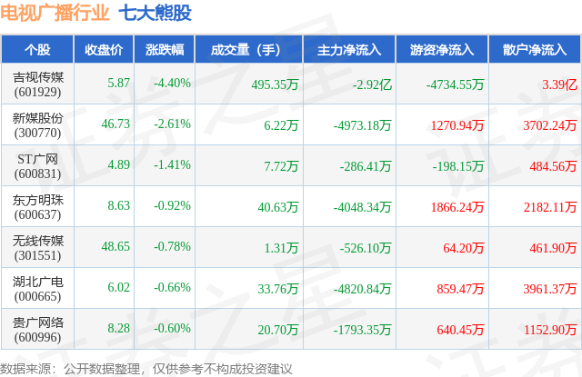 个股表现方面,电视广播行业当日领跌股为吉视传媒(601929),该股当日报收5.87,下跌4.4%,成交量495.35万,主力资金净流出2.92亿元。新媒股份(300770)以下跌2.61%紧随其后,该股当日成交量6.22万,主力资金净流出4973.18万元。除此之外,ST广网(600831)、东方明珠(600637)、无线传媒(301551)均进入当日熊股之列。具体个股列表见下表: