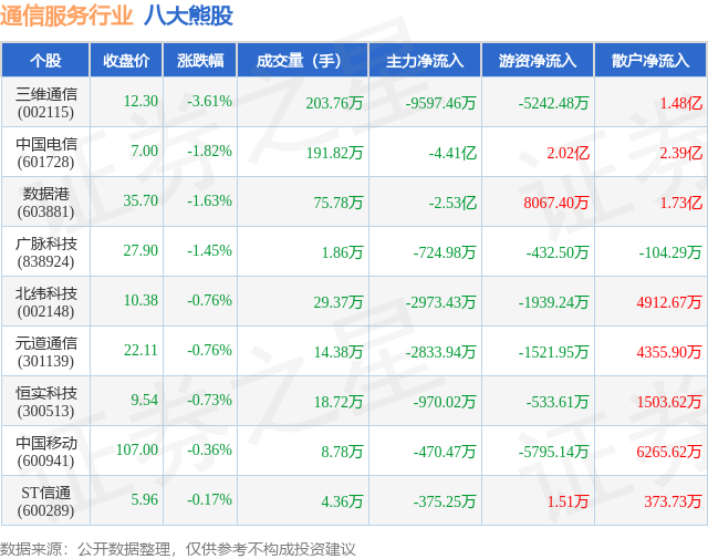 个股表现方面,通信服务行业当日领跌股为三维通信(002115),该股当日报收12.3,下跌3.61%,成交量203.76万,主力资金净流出9597.46万元。中国电信(601728)以下跌1.82%紧随其后,该股当日成交量191.82万,主力资金净流出4.41亿元。除此之外,数据港(603881)、广脉科技(838924)、北纬科技(002148)均进入当日熊股之列。具体个股列表见下表: