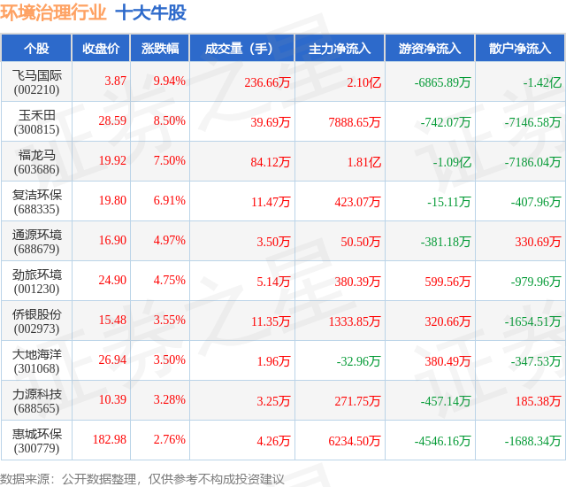 个股表现方面,环境治理行业当日领涨股为飞马国际(002210),该股当日报收3.87,上涨9.94%,成交量236.66万,主力资金净流入2.1亿元。玉禾田(300815)以上涨8.5%紧随其后,该股当日成交量39.69万,主力资金净流入7888.65万元。除此之外,福龙马(603686)、复洁环保(688335)、通源环境(688679)均进入当日牛股之列。具体个股列表见下表: