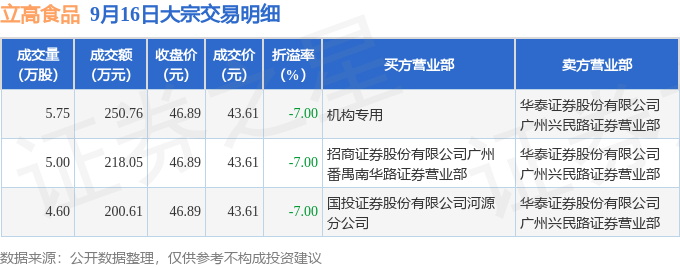 证券之星消息,9月16日立高食品发生大宗交易,交易数据如下: