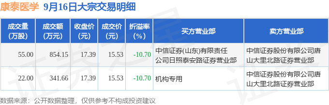 证券之星消息,9月16日康泰医学发生大宗交易,交易数据如下: