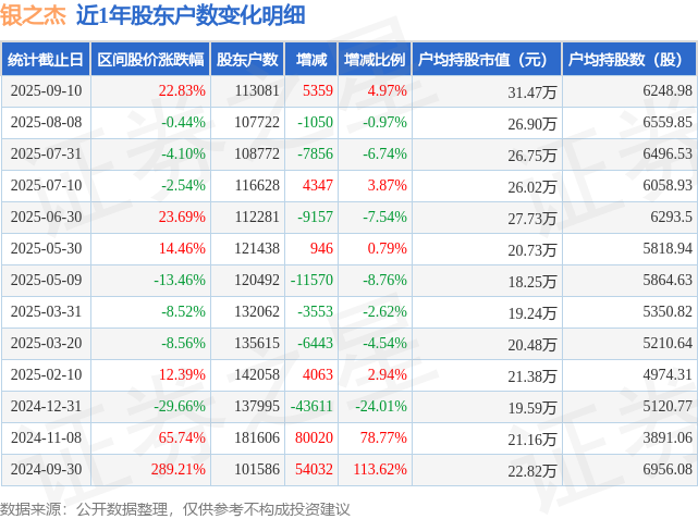 从股价来看,2025年8月8日至2025年9月10日,银之杰区间涨幅为22.83%,在此期间股东户数增加5359.0户,增幅为4.97%。