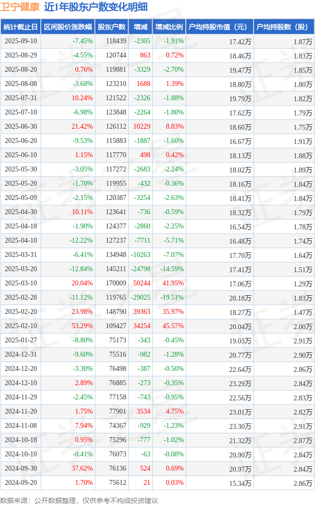 从股价来看,2025年8月29日至2025年9月10日,卫宁健康区间跌幅为7.45%,在此期间股东户数减少2305.0户,减幅为1.91%。