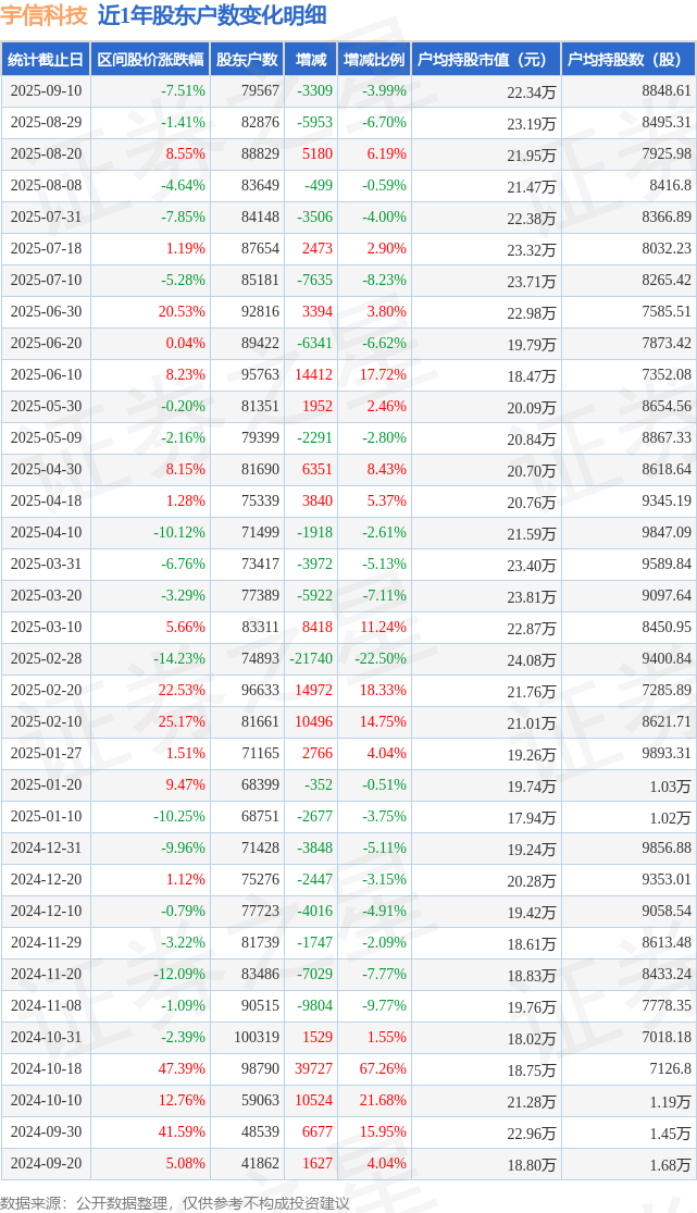 从股价来看,2025年8月29日至2025年9月10日,宇信科技区间跌幅为7.51%,在此期间股东户数减少3309.0户,减幅为3.99%。