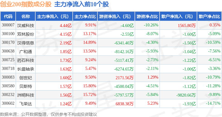 资金流向方面,创业200(399019)指数成份股当日主力资金净流出合计10.32亿元,游资资金净流出合计5.78亿元,散户资金净流入合计16.1亿元。成份股资金流向详情见下表: