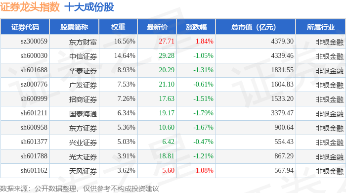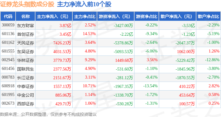 资金流向方面,证券龙头(399437)指数成份股当日主力资金净流出合计32.22亿元,游资资金净流入合计15.38亿元,散户资金净流入合计16.84亿元。成份股资金流向详情见下表: