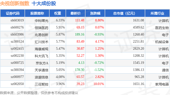 央视创新(399551)指数十大成份股详情如下:
