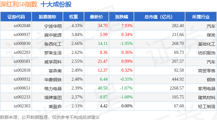 证券之星消息,9月16日,深红利50(399672)指数报收于4166.1点,涨0.49%,成交143.7亿元,换手率1.48%。当日该指数成份股中,上涨的有31家,宁波华翔以7.93%的涨幅领涨,下跌的有17家,上峰水泥以2.02%的跌幅领跌。