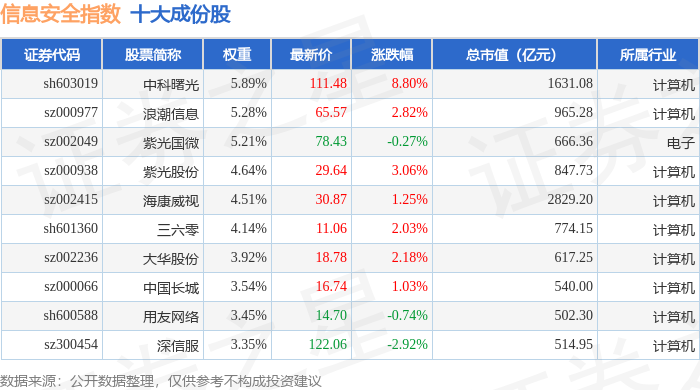 证券之星消息,9月16日,信息安全(399994)指数报收于1931.24点,涨1.86%,成交667.86亿元,换手率3.73%。当日该指数成份股中,上涨的有55家,华胜天成以10.03%的涨幅领涨,下跌的有8家,深信服以2.92%的跌幅领跌。