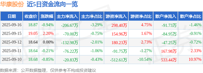 证券之星消息,截至2025年9月16日收盘,华康股份(605077)报收于18.87元,下跌0.94%,换手率1.12%,成交量3.35万手,成交额6287.82万元。