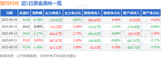 证券之星消息,截至2025年9月16日收盘,爱玛科技(603529)报收于34.48元,下跌0.38%,换手率0.52%,成交量4.39万手,成交额1.51亿元。