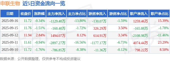 证券之星消息,截至2025年9月16日收盘,申联生物(688098)报收于11.72元,下跌0.34%,换手率1.69%,成交量6.95万手,成交额8184.22万元。