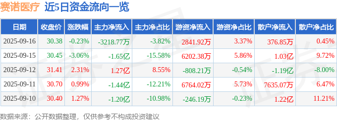 证券之星消息,截至2025年9月16日收盘,赛诺医疗(688108)报收于30.38元,下跌0.23%,换手率6.6%,成交量27.45万手,成交额8.43亿元。