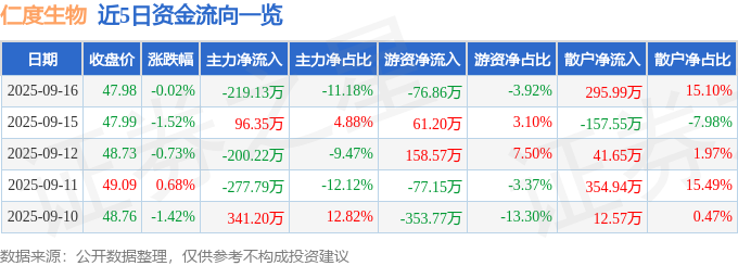 证券之星消息,截至2025年9月16日收盘,仁度生物(688193)报收于47.98元,下跌0.02%,换手率1.29%,成交量4087.0手,成交额1960.61万元。