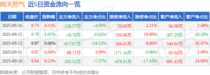 证券之星消息,截至2025年9月16日收盘,皖天然气(603689)报收于8.79元,上涨0.11%,换手率0.63%,成交量3.08万手,成交额2696.26万元。