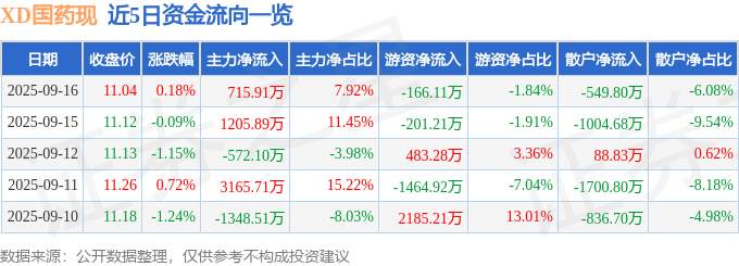 证券之星消息,截至2025年9月16日收盘,XD国药现(600420)报收于11.04元,上涨0.18%,换手率0.61%,成交量8.2万手,成交额9037.11万元。