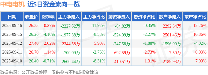 证券之星消息,截至2025年9月16日收盘,中电电机(603988)报收于26.33元,上涨0.27%,换手率3.04%,成交量7.15万手,成交额1.87亿元。
