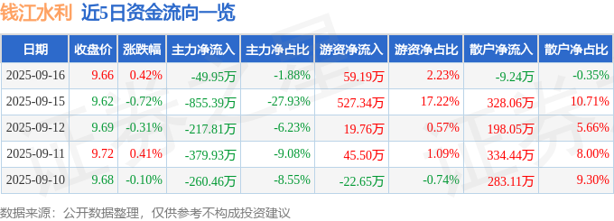 证券之星消息,截至2025年9月16日收盘,钱江水利(600283)报收于9.66元,上涨0.42%,换手率0.51%,成交量2.76万手,成交额2658.55万元。