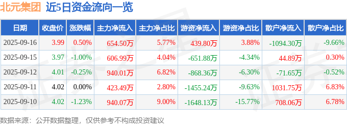证券之星消息,截至2025年9月16日收盘,北元集团(601568)报收于3.99元,上涨0.5%,换手率0.72%,成交量28.48万手,成交额1.13亿元。