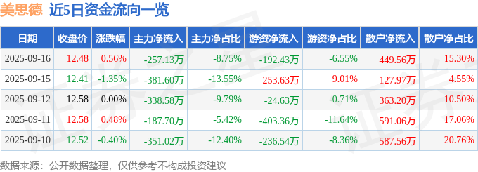 证券之星消息,截至2025年9月16日收盘,美思德(603041)报收于12.48元,上涨0.56%,换手率1.29%,成交量2.36万手,成交额2938.57万元。