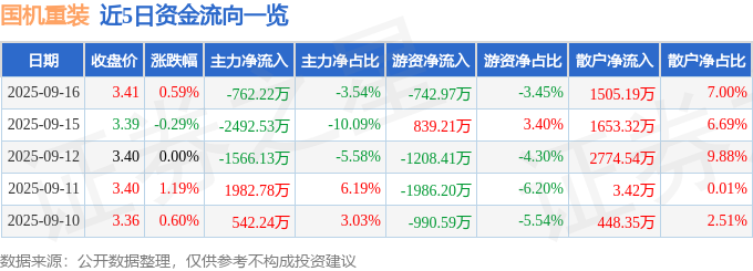 证券之星消息,截至2025年9月16日收盘,国机重装(601399)报收于3.41元,上涨0.59%,换手率0.88%,成交量63.34万手,成交额2.15亿元。