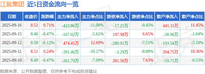 证券之星消息,截至2025年9月16日收盘,江盐集团(601065)报收于8.52元,上涨0.71%,换手率1.09%,成交量4.54万手,成交额3853.15万元。
