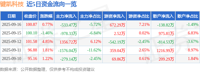 证券之星消息,截至2025年9月16日收盘,键凯科技(688356)报收于100.87元,上涨0.77%,换手率1.53%,成交量9264.0手,成交额9324.52万元。
