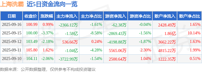 证券之星消息,截至2025年9月16日收盘,上海洗霸(603200)报收于100.99元,上涨0.99%,换手率8.43%,成交量14.79万手,成交额14.68亿元。