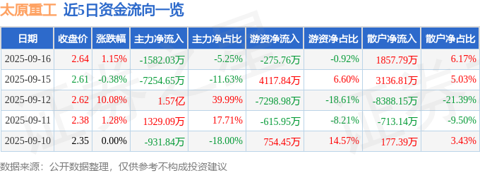 证券之星消息,截至2025年9月16日收盘,太原重工(600169)报收于2.64元,上涨1.15%,换手率3.44%,成交量114.76万手,成交额3.01亿元。