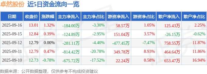 证券之星消息,截至2025年9月16日收盘,卓然股份(688121)报收于13.01元,上涨1.32%,换手率2.11%,成交量4.28万手,成交额5571.66万元。