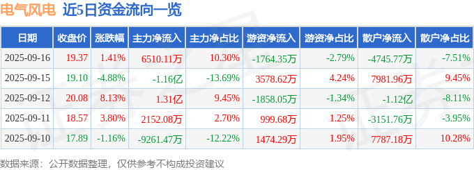证券之星消息,截至2025年9月16日收盘,电气风电(688660)报收于19.37元,上涨1.41%,换手率2.43%,成交量32.42万手,成交额6.32亿元。
