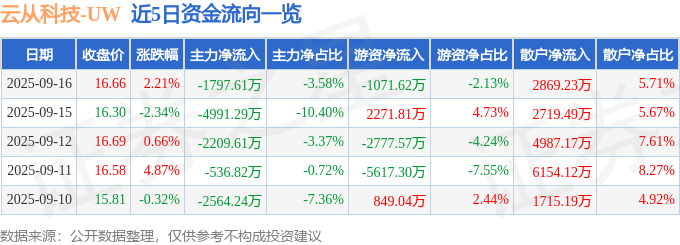 证券之星消息,截至2025年9月16日收盘,云从科技(688327)报收于16.66元,上涨2.21%,换手率3.63%,成交量30.25万手,成交额5.03亿元。